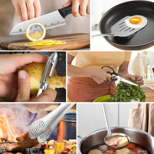 Each utensil is crafted from premium stainless steel, giving you durability, corrosion resistance, and long-lasting sharpness. The ergonomic handles fit comfortably in your hand, ensuring precision and ease whether youβre flipping burgers or slicing vegetables.