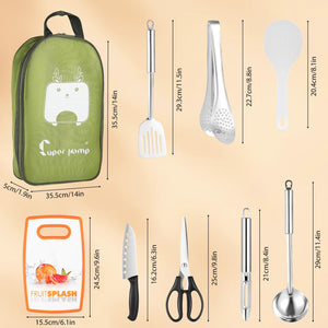 This all-in-one kit is your mobile outdoor kitchen, neatly packed and ready for any campsite or picnic. It includes eight essential tools β spoon, BBQ tongs, spatula, rice spoon, kitchen knife, scale scraper, scissors, and cutting board β all designed for practical outdoor cooking.