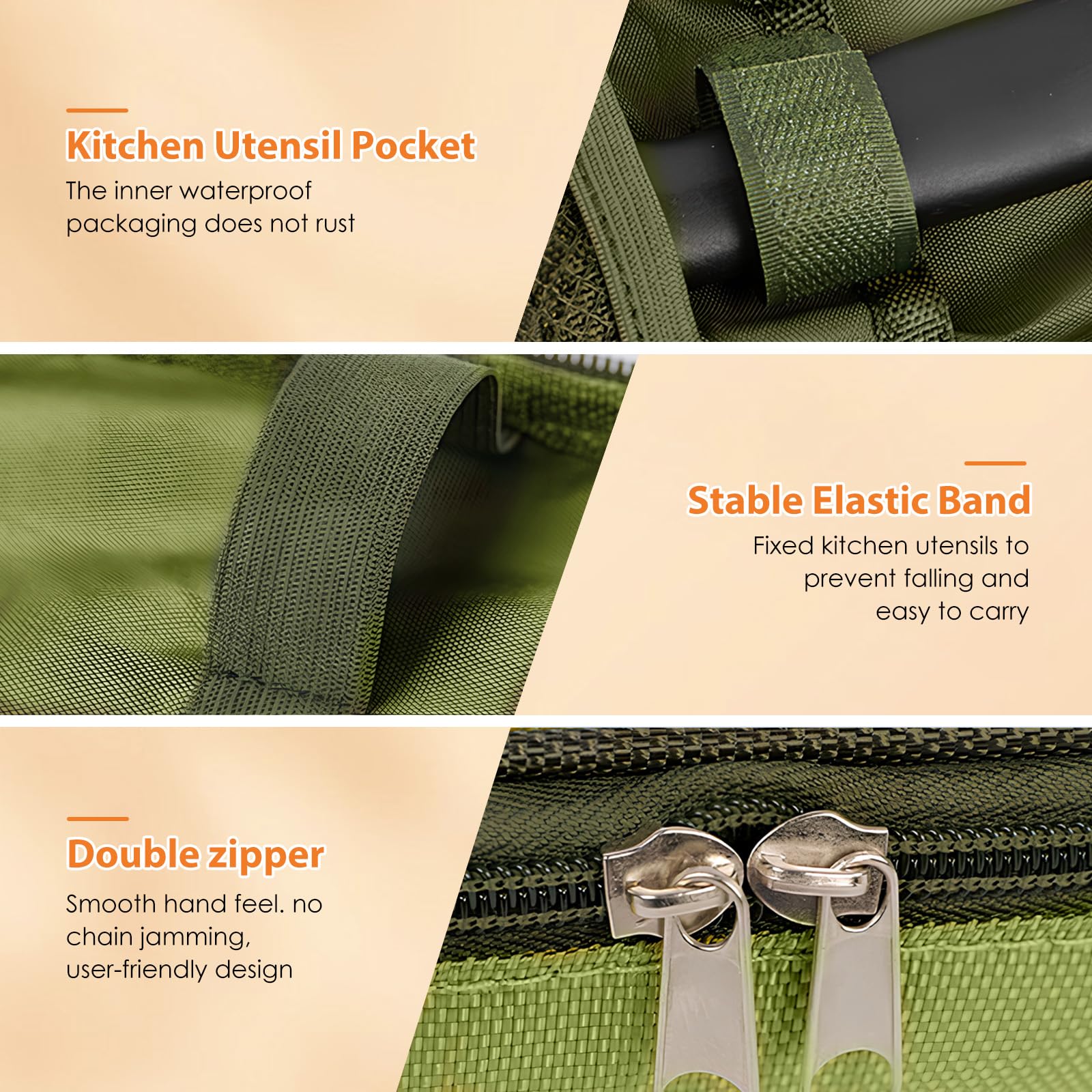 Unzip the case and youβll find every tool neatly arranged and ready to go β a tidy, spacious design that keeps everything visible and accessible. Despite its small footprint, the kit covers all your cooking essentials.