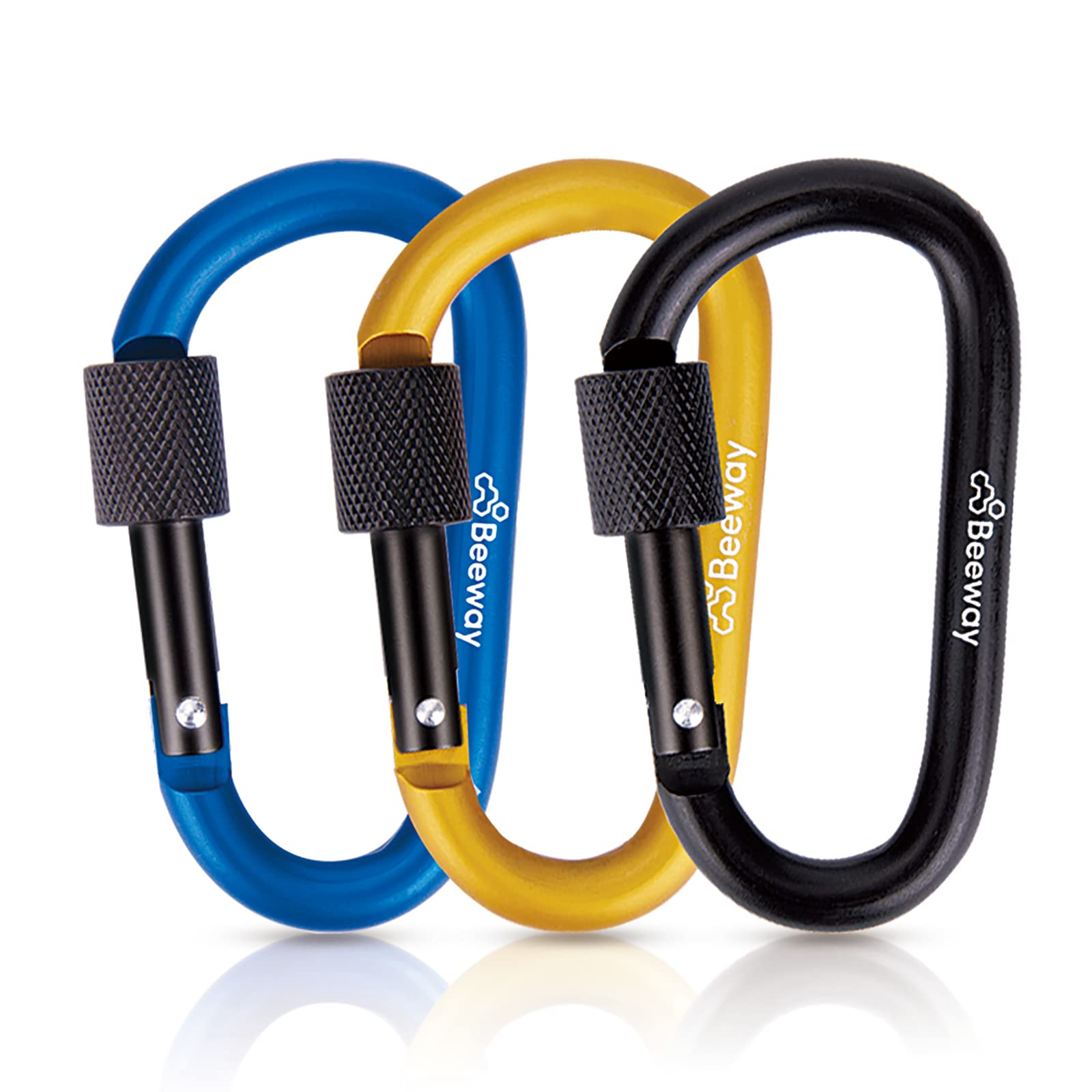 BeeWay Aluminium Locking Carabiner Set β 3 Pack (Black, Blue, Gold)