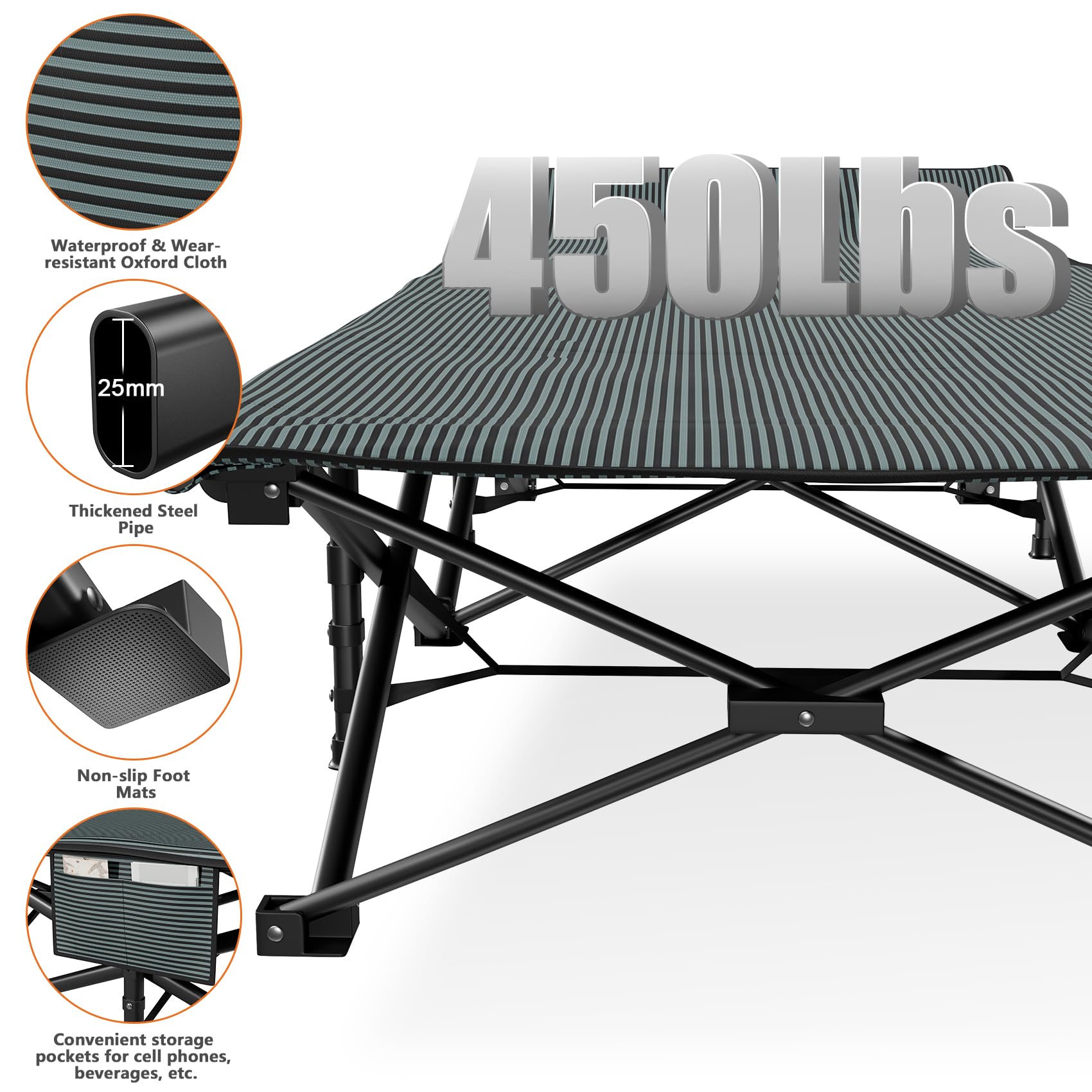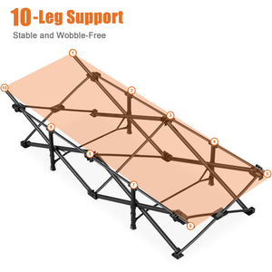 Built to last with a reinforced steel tube frame and 10-leg cross-support system, this cot supports up to 450 lbs (≈204 kg). Generous sleeping area of 190 × 71 × 41 cm (75" × 28" × 16") provides plenty of room for adults and kids alike.