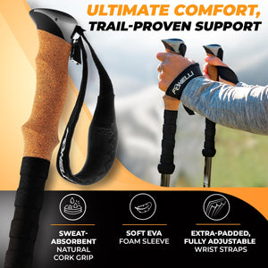- PROVIDING THE ULTIMATE COMFORT: The anti-slip natural cork grips absorb sweat and moisture and will keep your hands cool and dry during those challenging long-distance hikes. The extra-padded, fully adjustable, breathable wrist straps make sure that you don’t accidentally drop your hiking sticks, and provide you with the maximum comfort throughout the day. The extended foam sleeves, made of soft EVA foam, will aid you during switchbacks and abrupt changes in terrain.