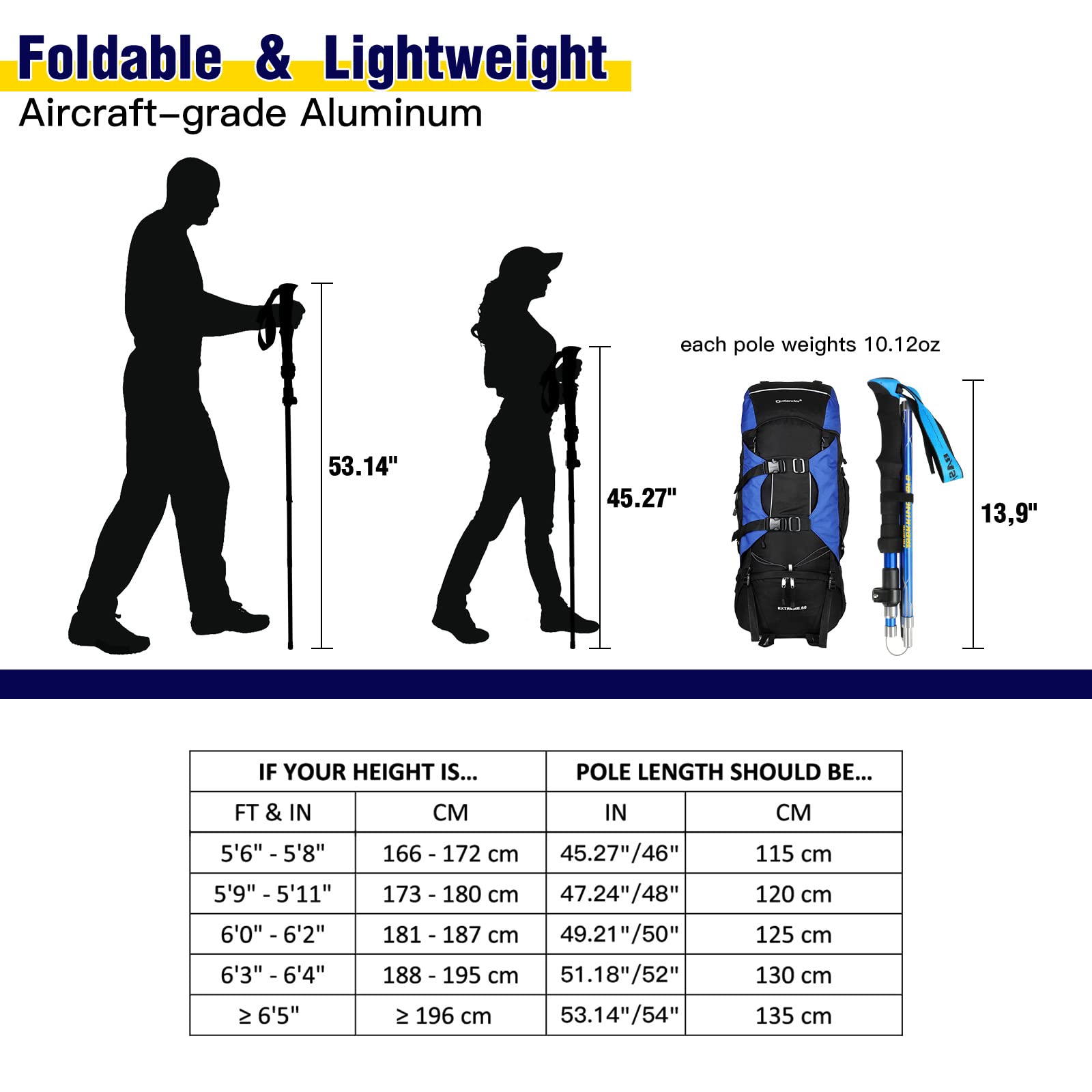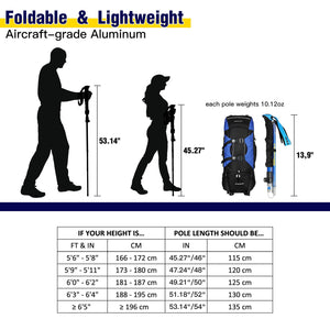 - Foldable and compact: The foldable triple design of these hiking poles allows them to be folded to a portable size of 13.9 inches, convenient and fast. They fit into your hiking backpack, duffel bag or luggage case with ease. You can extend your trekking poles from 45.3 inches to 53.2 inches.