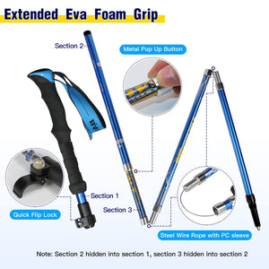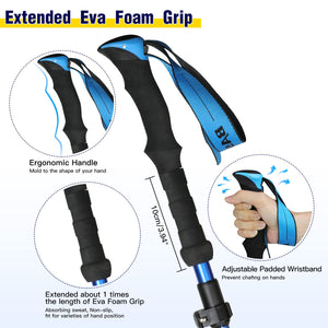 Details: HUGSEE Blue Trekking Poles Collapsible combine strong aluminum alloy construction, moisture-wicking ergonomic extended Eva foam handles with soft padded wrist straps adjustable to create a comfortable long-distance hiking experience.