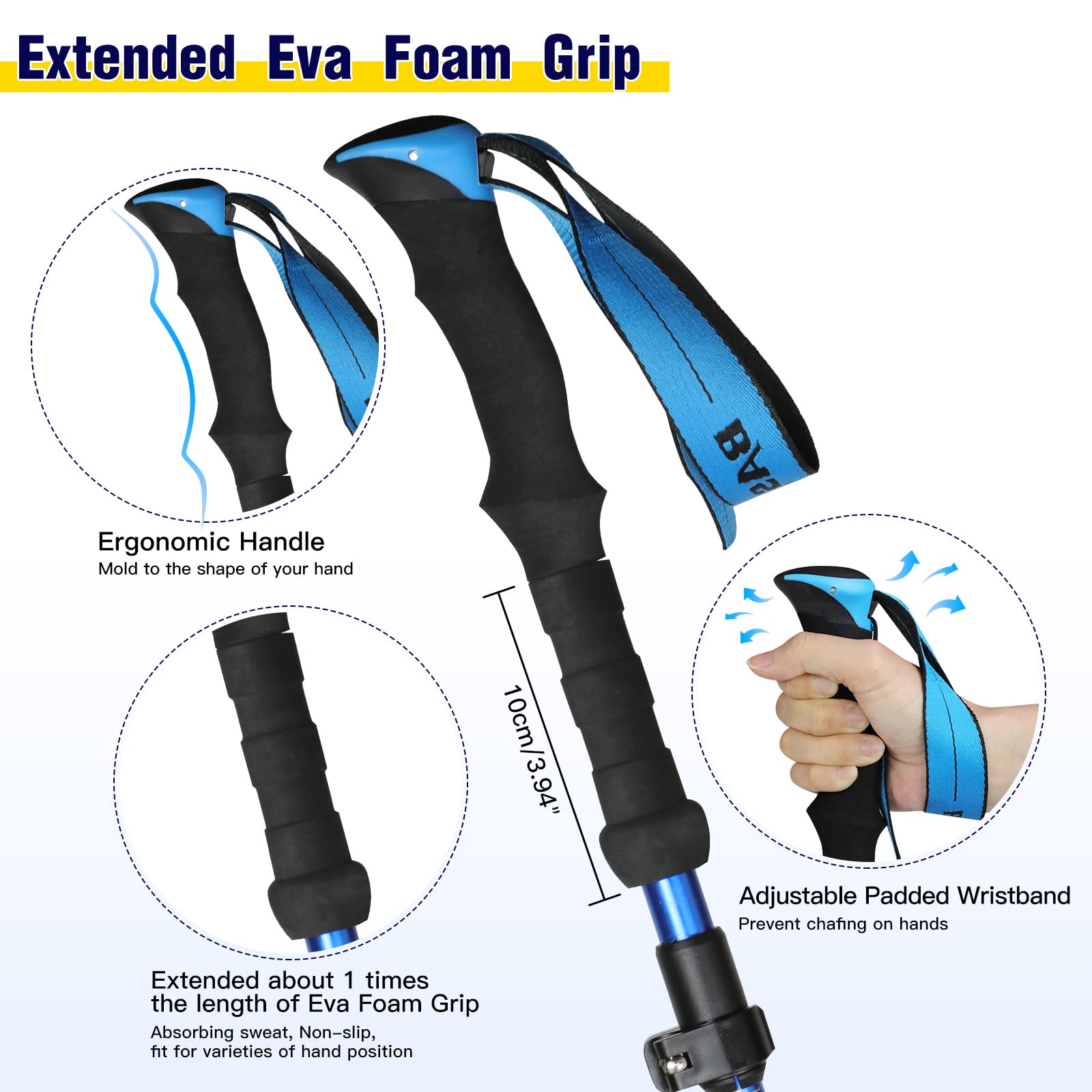 - Ergonomic extended EVA foam handle & adjustable wrist strap: The EVA foam handle of the hiking pole has extended by 2.75 inches, allows different hand positions, absorbs sweat and keeps your hands cool and dry, also helps you easily handle switchback and abrupt changes in the terrain.