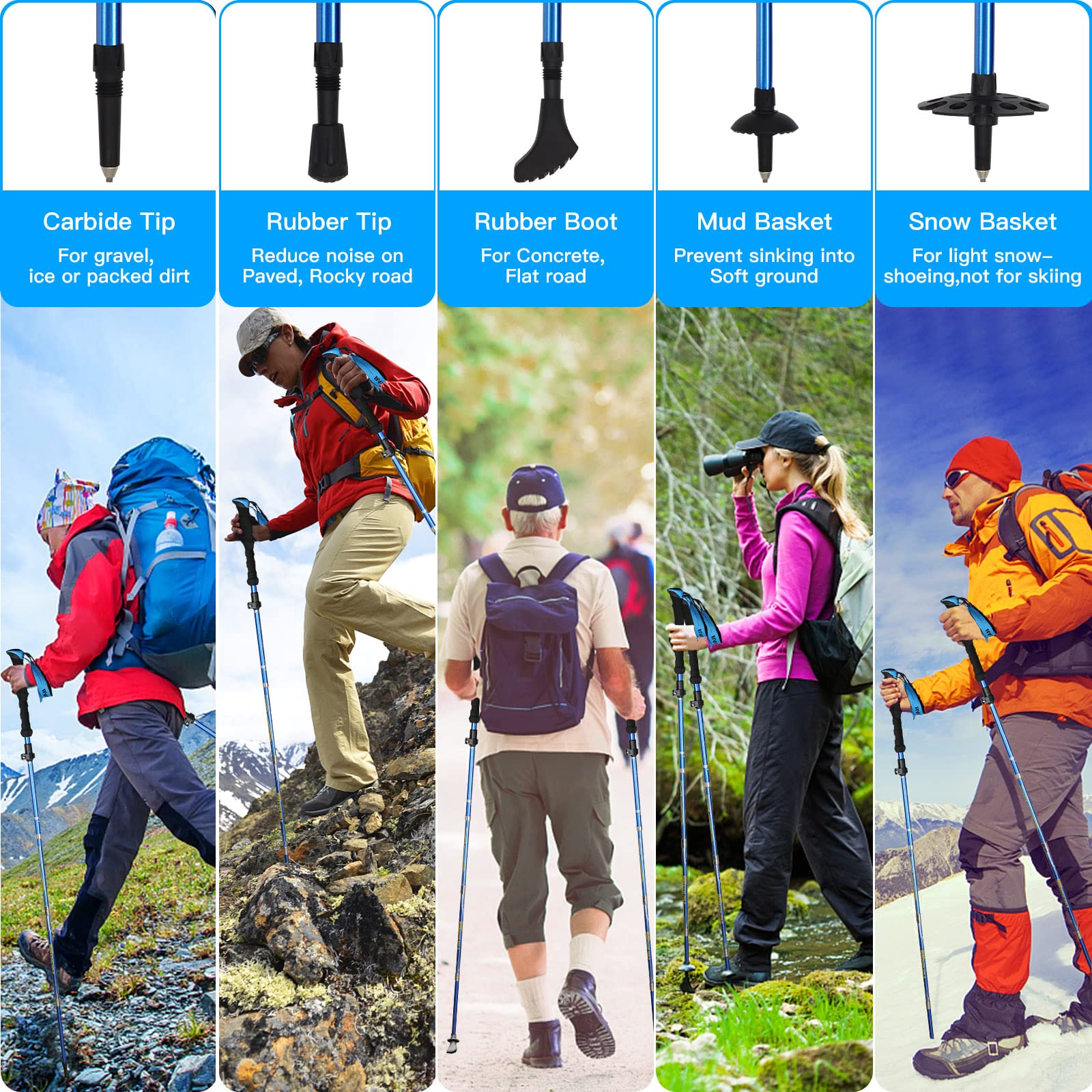 - Versatile trekking poles: the trekking poles for women hiking foldable with essential pole tips accessories are suitable for all terrains and conditions. From climbing in the mountains to flat concrete roads or from snowy terrain to softer ground, durable 4-season accessories (1 pair of rubber tips each, rubber boots for hard surfaces, snow baskets, mud baskets) and a wear-resistant practical tungsten steel tip are essential.