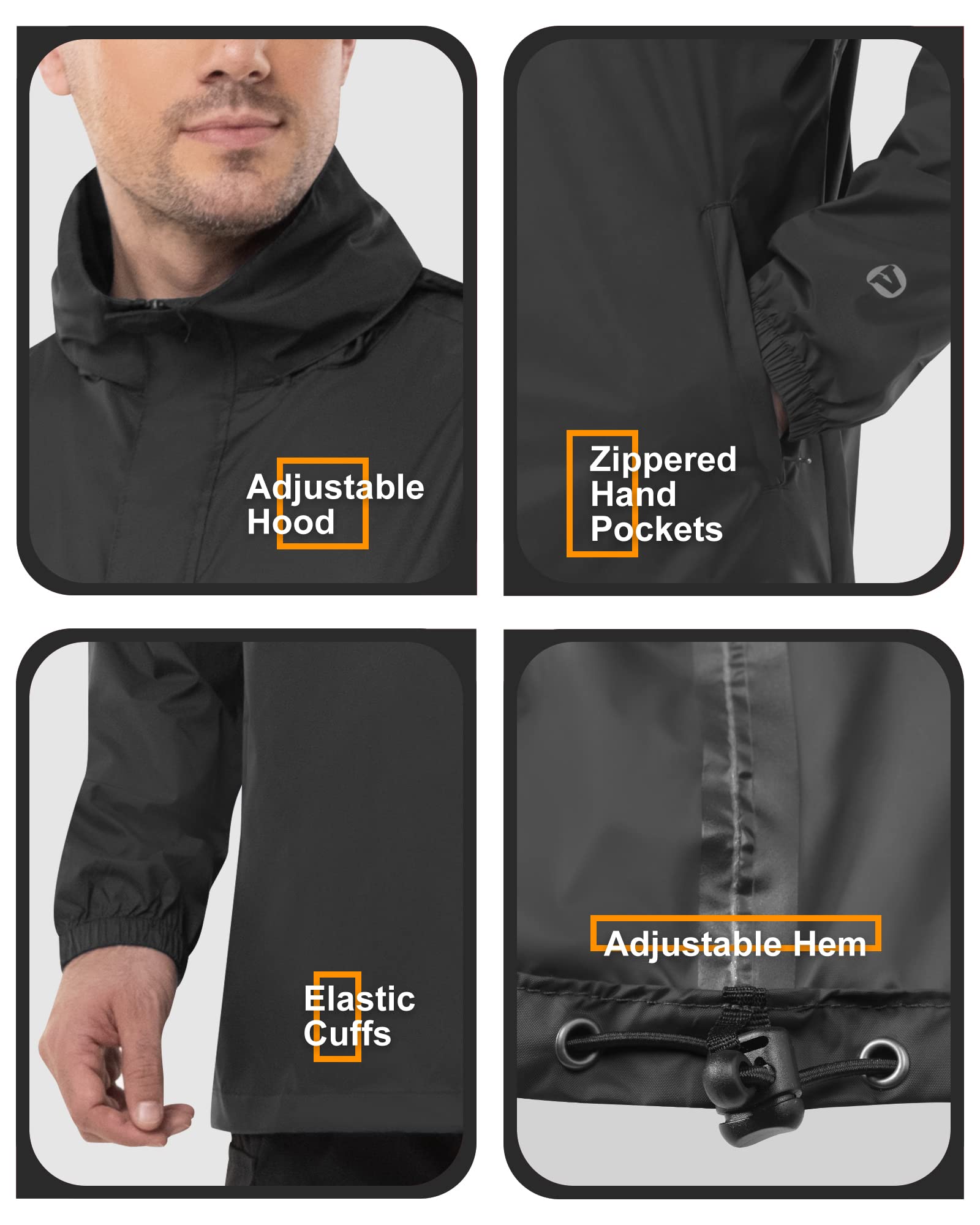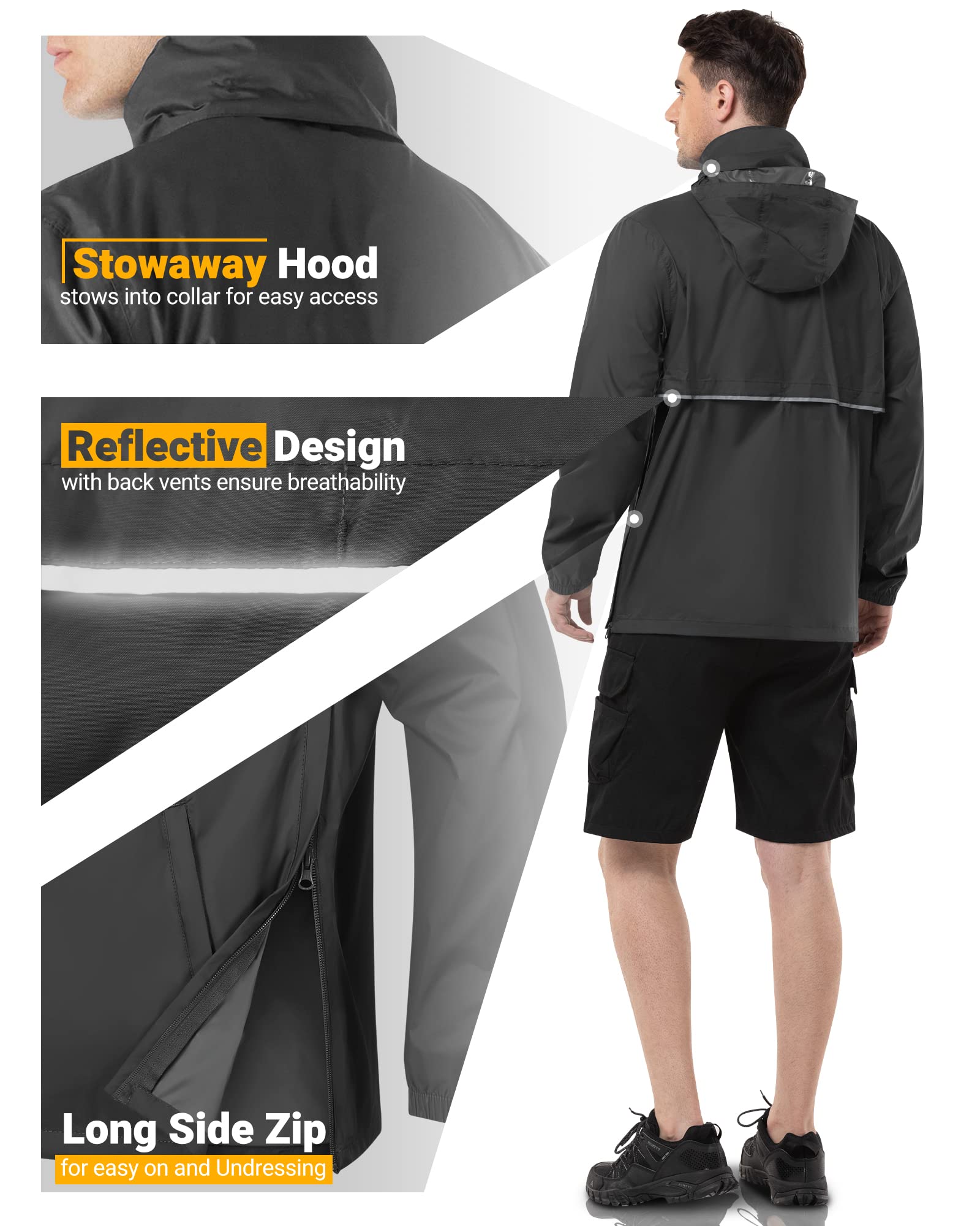 Outdoor Ventures Rain Jacket for Men Waterproof Pullover Lightweight Hooded Outdoor Raincoat Packaway Breathable Reflective Anorak Jacket for Travelling, Camping, Running, Hiking, Black M