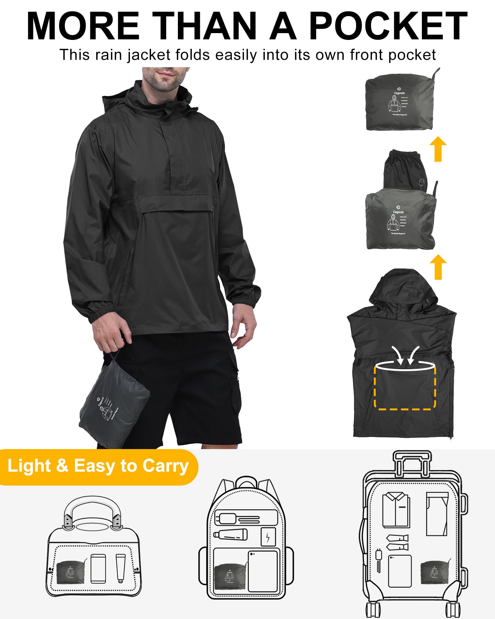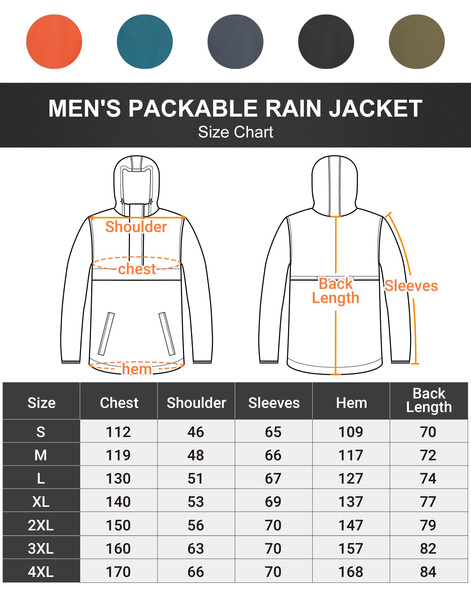 - Packable: This packable pullover rain coat effortlessly packs away into its own front pouch pocket, for fast, convenience, and compact storage. A perfect piece of outerwear that you can always keep on hand, when the weather is unpredictable. It's intelligently designed to allow minimal space occupation.